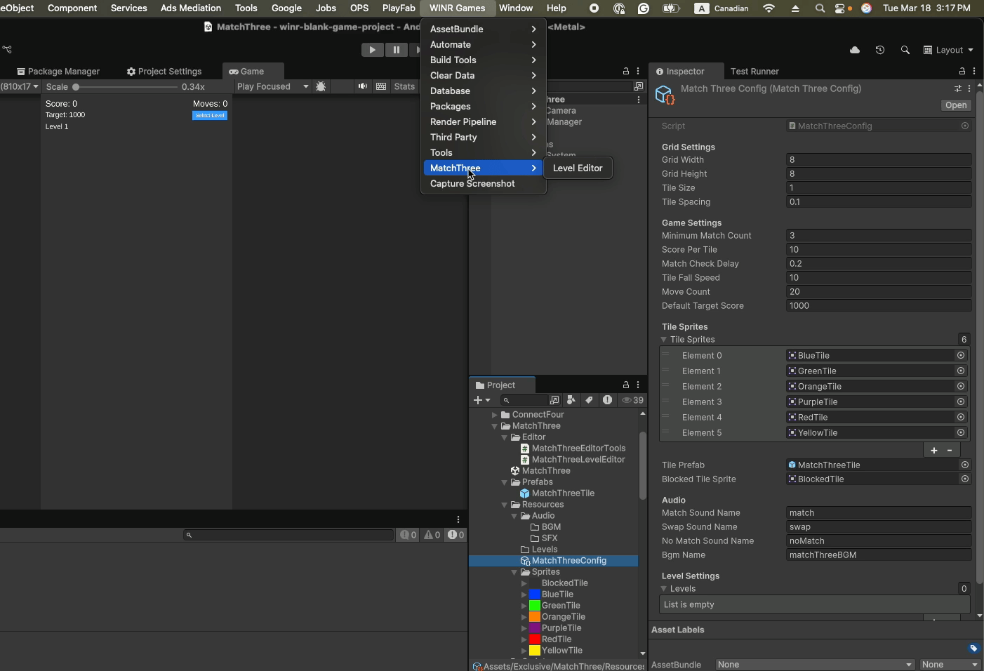 As the AI-generated project took shape, I learned which parts worked well and which didn’t. I soon had a functioning match-3 prototype with the objective of cloning the feel of popular games like Candy Crush or Royal Match. The initial output from the AI was a very barebones game: just four core game scripts and one editor script that created the whole match-3 setup. The editor-driven game setup created everything needed — a grid prefab, some ScriptableObject assets for level configuration, and placeholder sprites for tiles. The basic game flow was there too: it kept track of score and moves, and included a simple UI that let you restart the game when you ran out of moves.